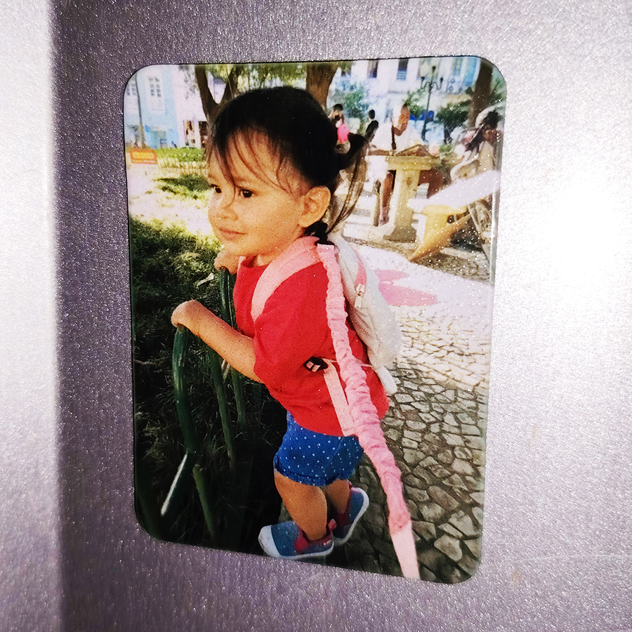 Fotografía personalizada en magneto para refrigerador rectangular de 5,5×7,5 cms. La técnica utilizada es mediante sublimación.