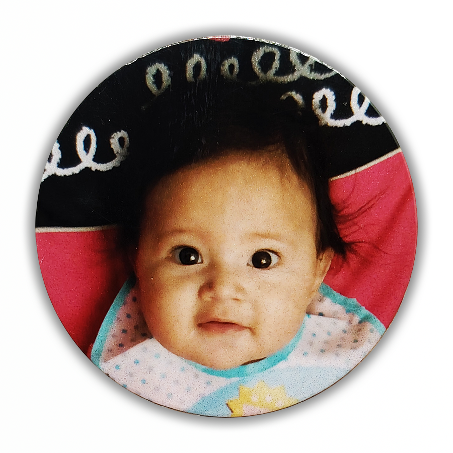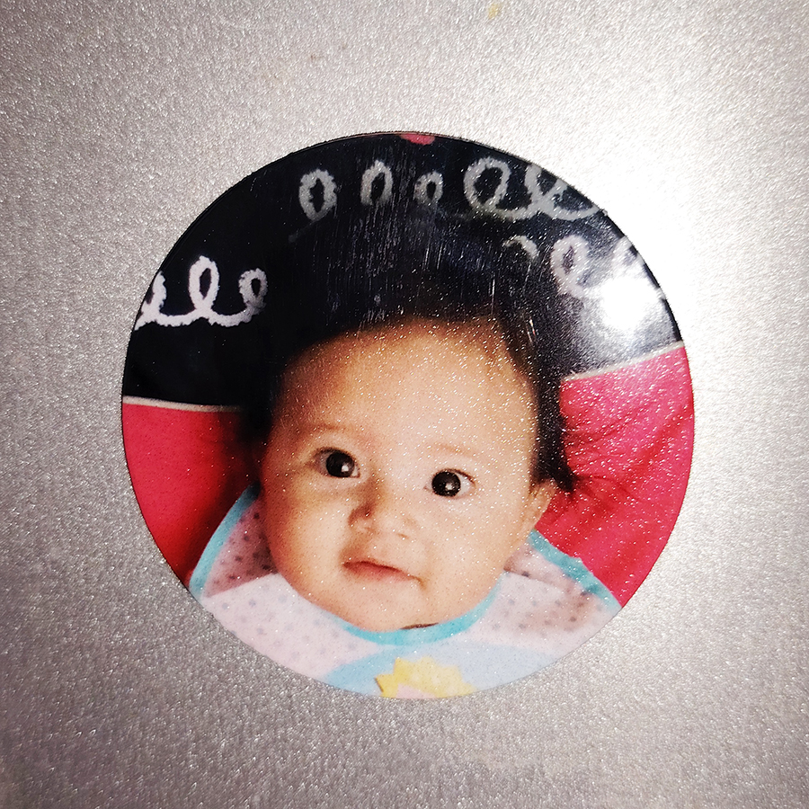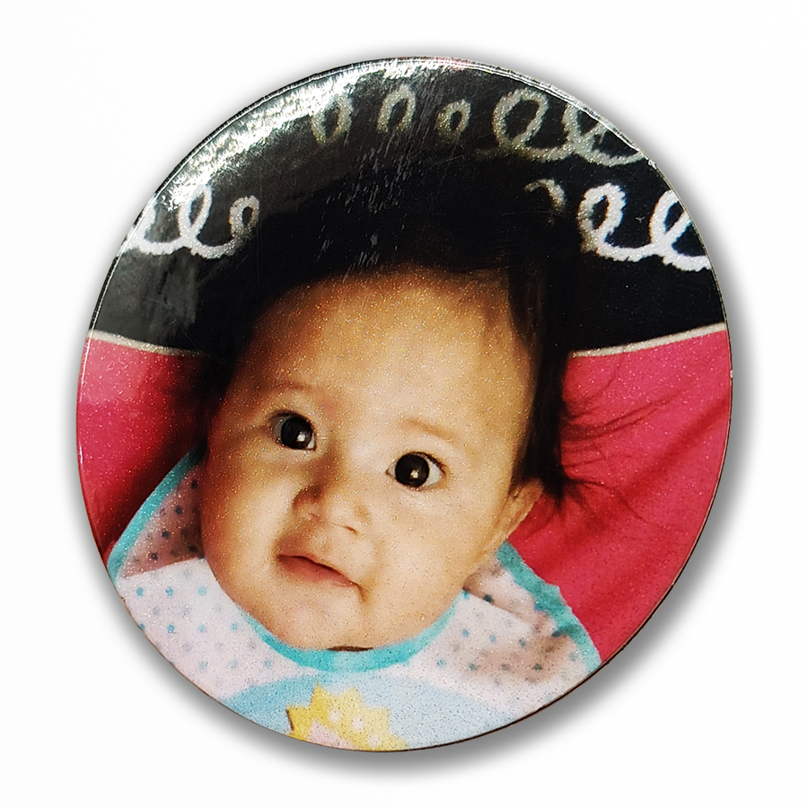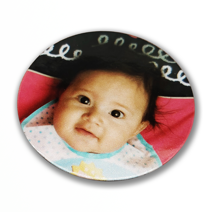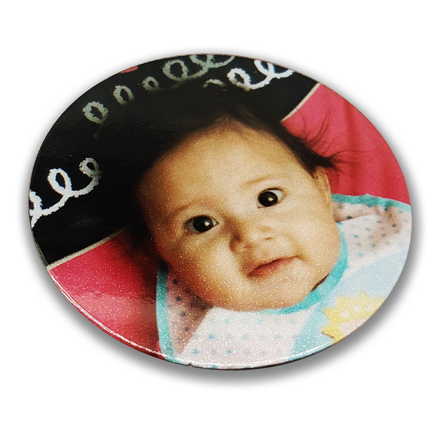 Fotografía personalizada en magneto para refrigerador redondo de 6,5×6,5 cms. La técnica utilizada es mediante sublimación.