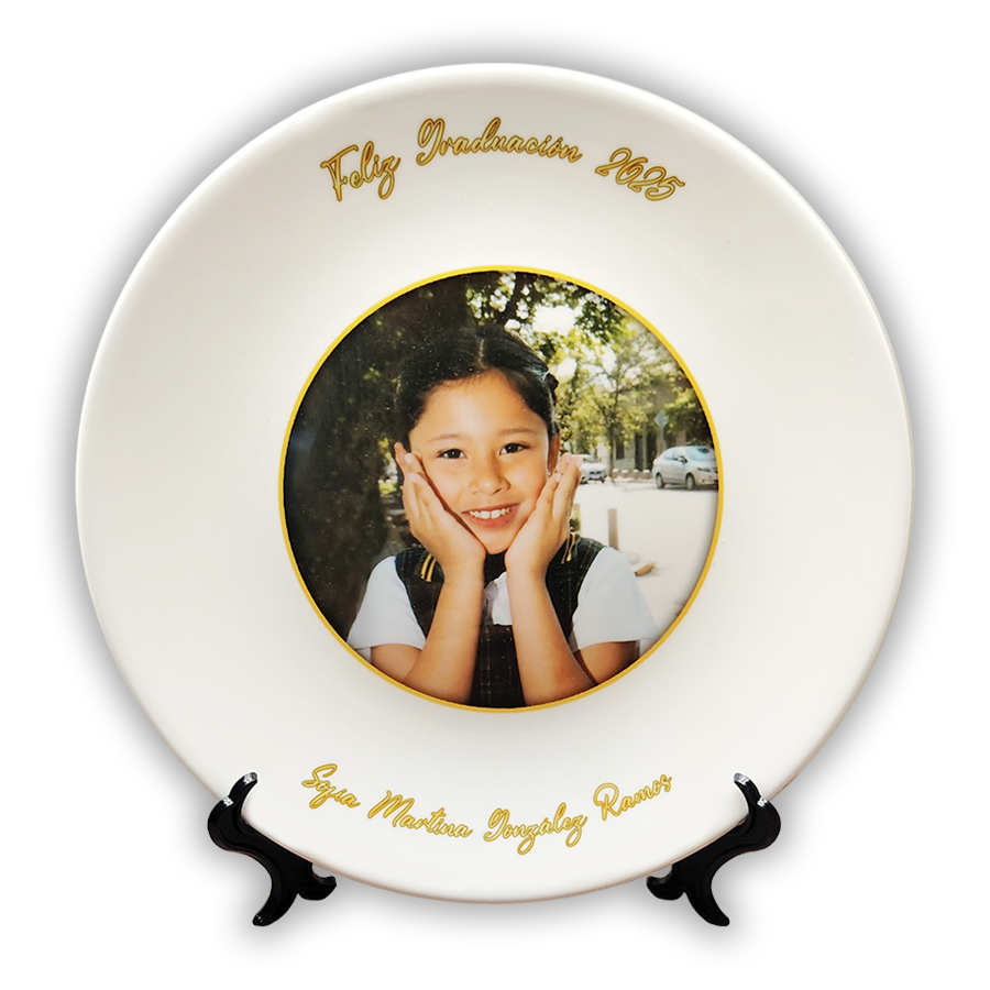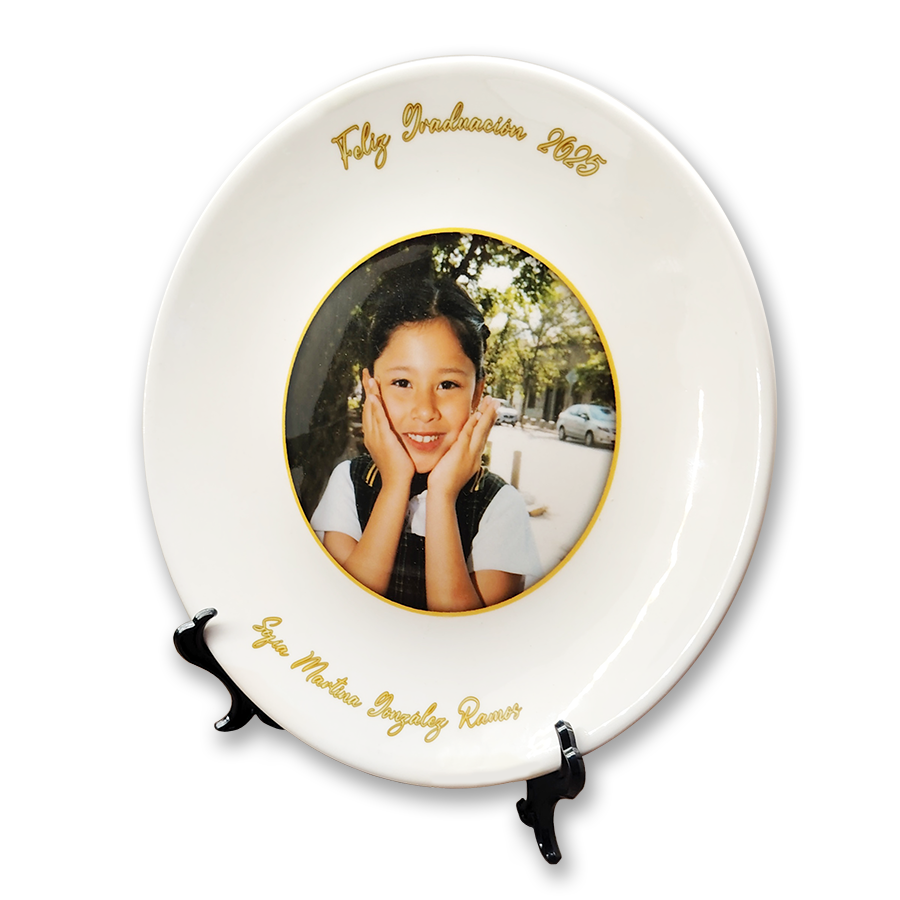 Fotografía personalizada en plato de cerámica de forma redonda, de diámetro 25 cms. La técnica utilizada es mediante sublimación.